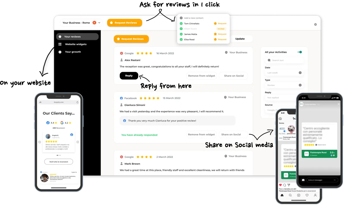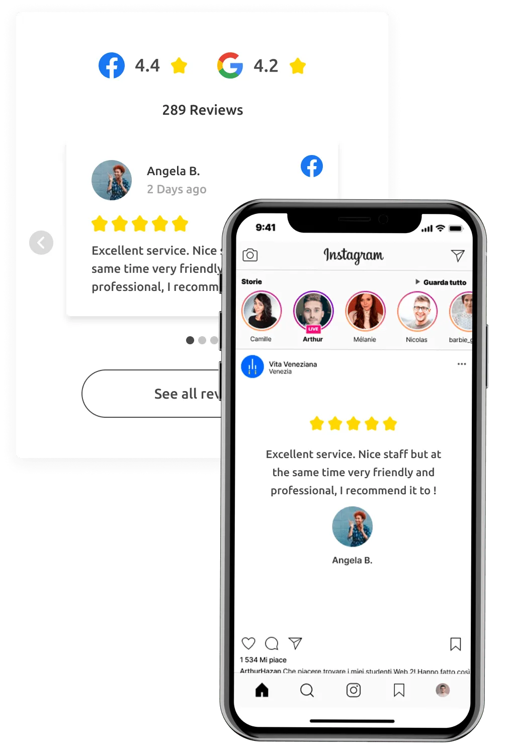 Share the best reviews on your Facebook or Instagram page via customizable templates.